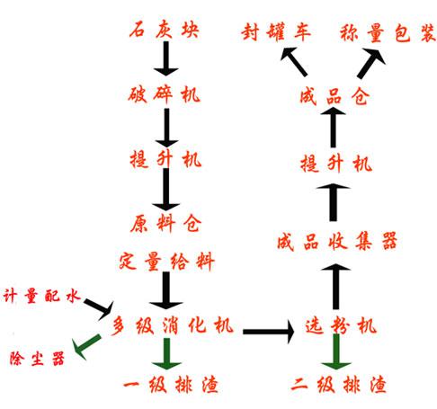 原料生石灰由裝載機加料倉中,并由振動給料機均勻給料到破碎機破碎10mm以下。破碎后的生石灰經輸送設備送入多級消化器。加水攪拌經多級消化反應生成氫氧化鈣。消化過程中產生水蒸氣及揚塵經除塵器過濾后排空。消化后氫氧化鈣經輸送設備送入氫氧化鈣分級機(選粉機)分級。合格細粉經輸送設備送入成品料倉。不合格粗粉排查或根據工藝要求經輸送設備送入磨機(雷蒙磨)研磨。磨后經螺旋收粉器收集細粉。經輸送設備送入氫氧化鈣分級機(選粉機)分級。合格細粉經輸送設備送入成品料倉。雷蒙磨富余含塵氣體布袋除塵器過濾排空。收集細粉經輸送設備送入氫氧化鈣分級機(選粉機)分級。合格細粉經輸送設備送入成品料倉。